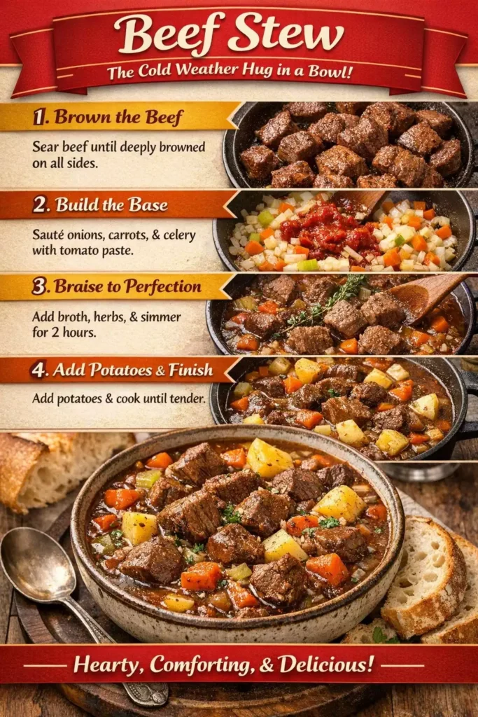 The browning step — searing the beef cubes in a hot pan before the braising liquid goes in — creates the Maillard reaction, which generates hundreds of flavor compounds that slow cooking alone cannot produce. Browned beef in stew has a deeper, more complex, more savory flavor than unbrowned beef. Skipping the browning step produces a pale, one-dimensional stew. The extra 10 minutes of browning is the single most impactful step in the recipe.