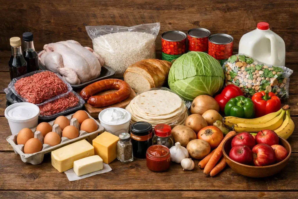 Here’s how one chicken serves four meals: Monday roast dinner → Wednesday fried rice (leftover meat) → Thursday rosol (carcass boiled for broth) → Friday’s rosol leftovers become the base for a quick noodle soup lunch. One $8 chicken. Four meals. $2 per meal for the protein component. This cascading-ingredient approach is how my babcia stretched a family budget across a week, and it’s how I stretch $75 across seven days of dinners, breakfasts, and lunches for six people. The secret isn’t buying cheap food. It’s buying smart food that serves multiple purposes.