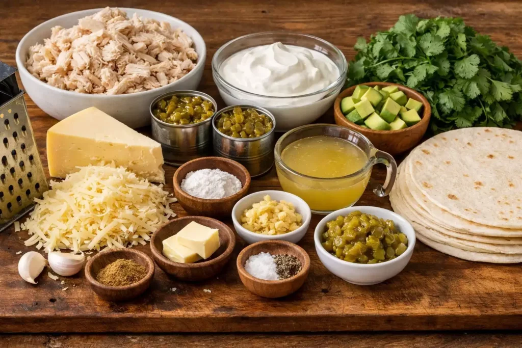 Mix the shredded chicken with 1 cup of shredded cheese, 1/2 cup sour cream, and a couple spoonfuls of the green chile sauce. The filling should be creamy and scoopable — rich enough to taste good but not so wet that the tortillas go soggy.