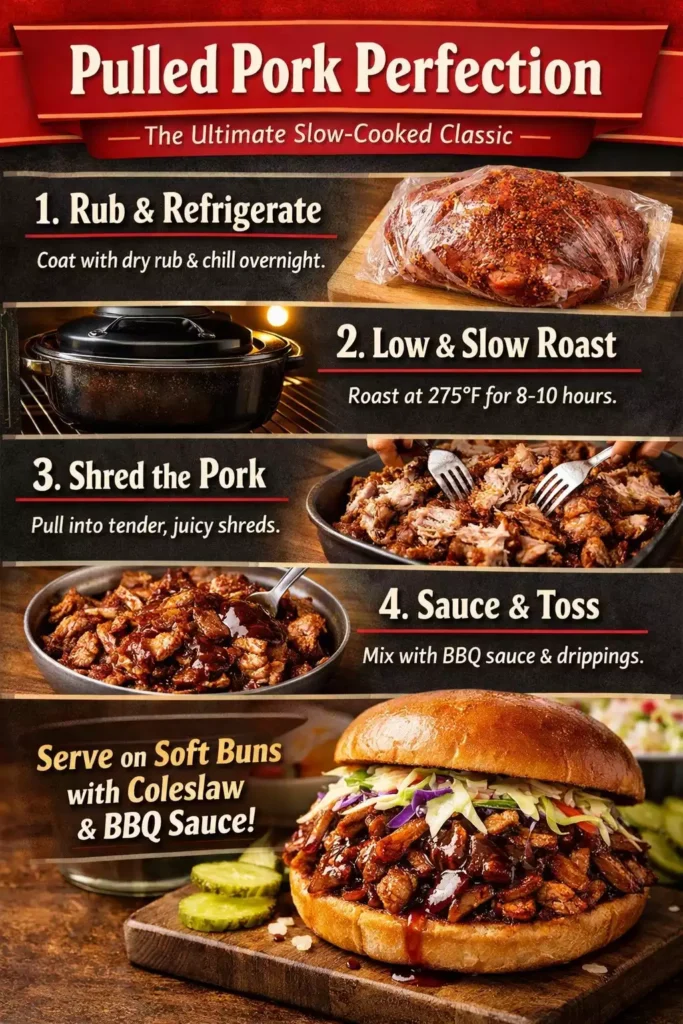 I made pulled pork for forty people last summer and there were no leftovers. This is the entire endorsement this recipe needs. Pulled pork — pork shoulder rubbed with a spice blend, slow-roasted until falling apart, pulled into tender, smoky shreds, and served on soft buns with coleslaw and barbecue sauce — is one of the most crowd-pleasing foods that exists. It scales endlessly, it improves if made the day before, and it produces the kind of smell while cooking that makes people text asking when dinner is three hours before it is ready.
