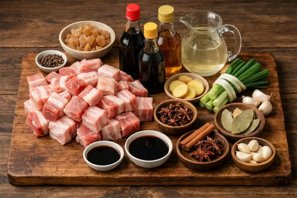 Pork belly with skin is traditional and correct. The skin becomes gelatinous during braising and is one of the best textures in the dish. Skinless pork belly is fine but loses this element. Ask your butcher for pork belly with skin on, cut into a block. Cut into cubes yourself at home — uniform 4cm cubes cook evenly and produce uniform texture throughout the dish.