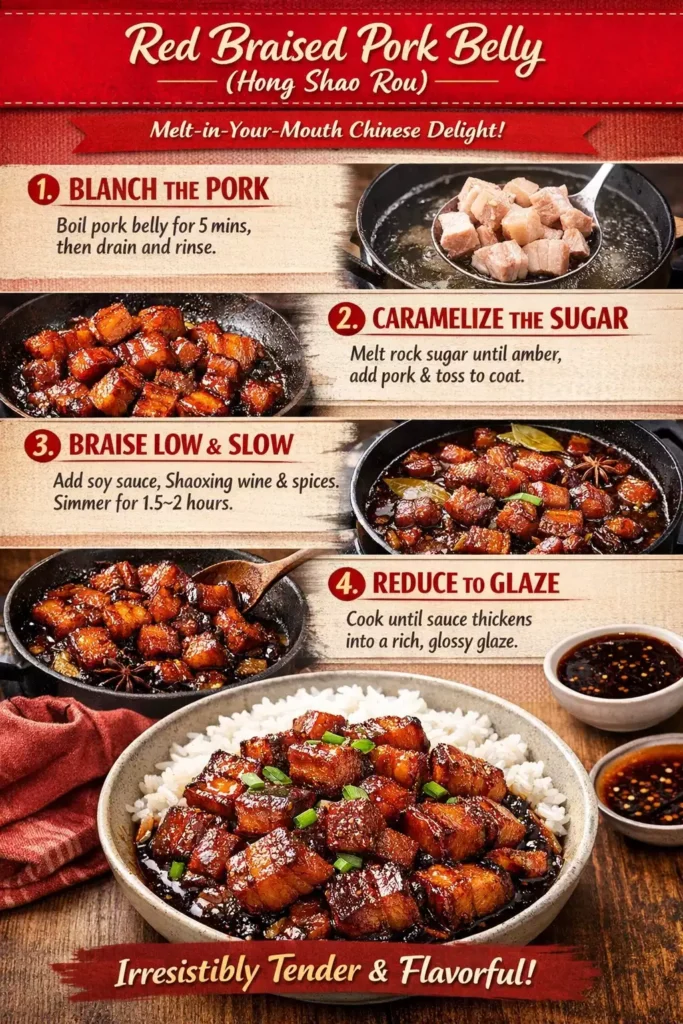 Refrigerate for up to 4 days. Skim the solidified fat from the top after refrigeration for a lighter result. Reheat gently on the stove with a splash of water to loosen the glaze. The flavor deepens significantly after 24 hours in the refrigerator — day two hong shao rou is, controversially, even better than day one. Freezes well for up to 3 months. This is a dish worth making in quantity.