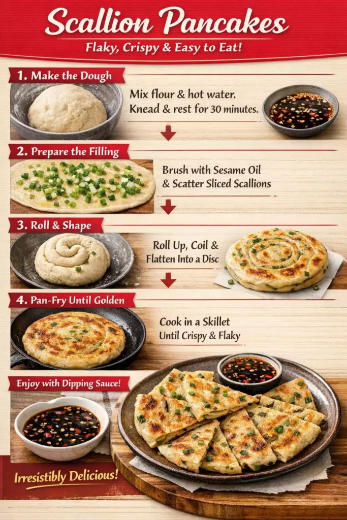 Scallion pancake layers are created by a simple roll-oil-roll technique: roll the dough flat, brush with sesame oil and scatter scallions, roll into a cylinder, coil the cylinder into a disc, then flatten again. This distributes oil throughout the layers, which create steam pockets during frying and produce the characteristic flaky, multi-layered texture. The more care taken in the roll-and-flatten step, the more distinct the layers.