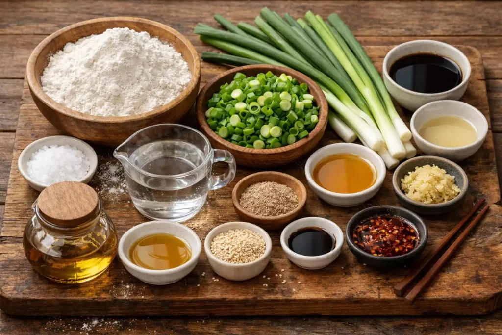 Oil is the flavor. Sesame oil in the layers is not background flavor — it is the primary flavor. Use good quality sesame oil. The scallions add fragrance; the sesame oil provides the deep, toasty richness that makes scallion pancakes taste like themselves.