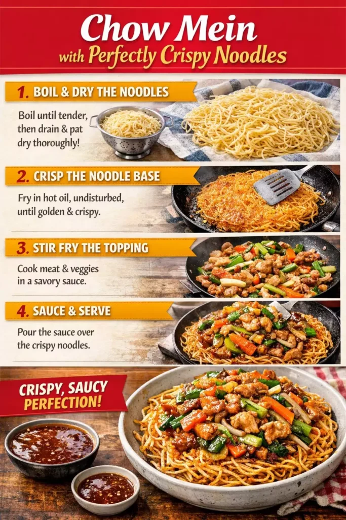 Crispy chow mein noodles require two things: dry noodles and a hot pan with adequate oil. After boiling, the noodles must be thoroughly drained and ideally dried briefly to remove surface moisture. They go into hot oil in a flat layer and must not be disturbed for at least 2–3 minutes — premature stirring prevents crust formation. The bottom layer crisps. Then the whole cake flips. Then the top layer crisps. Then the sauce goes on top.