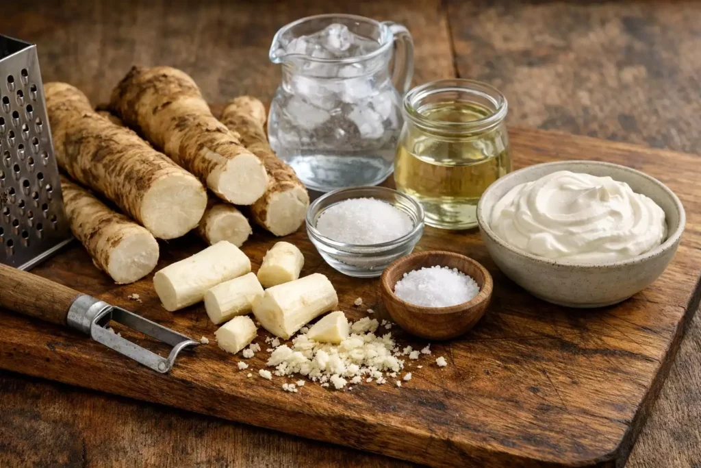 Open a window. Seriously. The volatile compounds released by grating fresh horseradish are significantly stronger than cutting onions and will make your eyes and nose react dramatically. Grate the horseradish on the fine side of a box grater, or pulse in a food processor (which contains the vapors better). Work in small batches and step back frequently. This is not a hardship — it is a rite of passage.