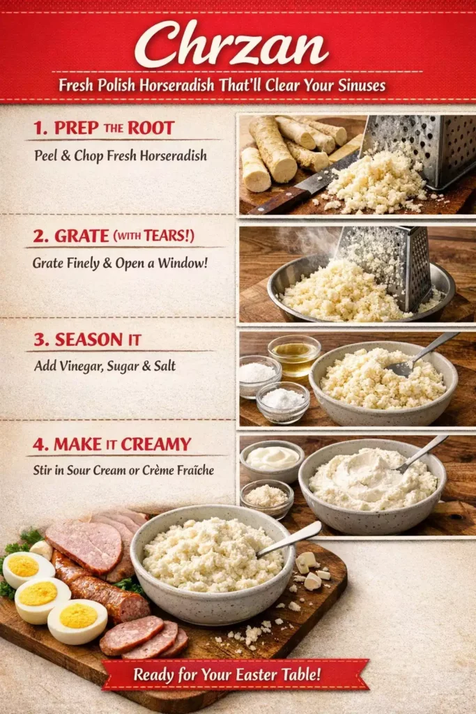 Make it the day before. Freshly made chrzan is intensely hot. After 12 hours in the fridge the flavors settle and mellow slightly without losing their character. Easter morning chrzan made the night before is genuinely better than chrzan made the morning of.