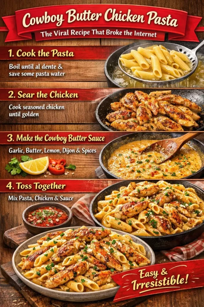 The internet broke over this recipe and for once, the internet was right. Cowboy butter chicken pasta is one of those viral recipes that actually delivers. The first time I made it, I understood the hype within one bite — garlic, lemon, herbs, Dijon, chilli, all melted into butter and cream, clinging to every noodle, with juicy chicken on top. It’s bold, unapologetic flavour that makes you wonder why all pasta isn’t like this.