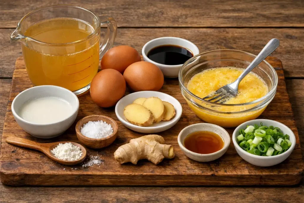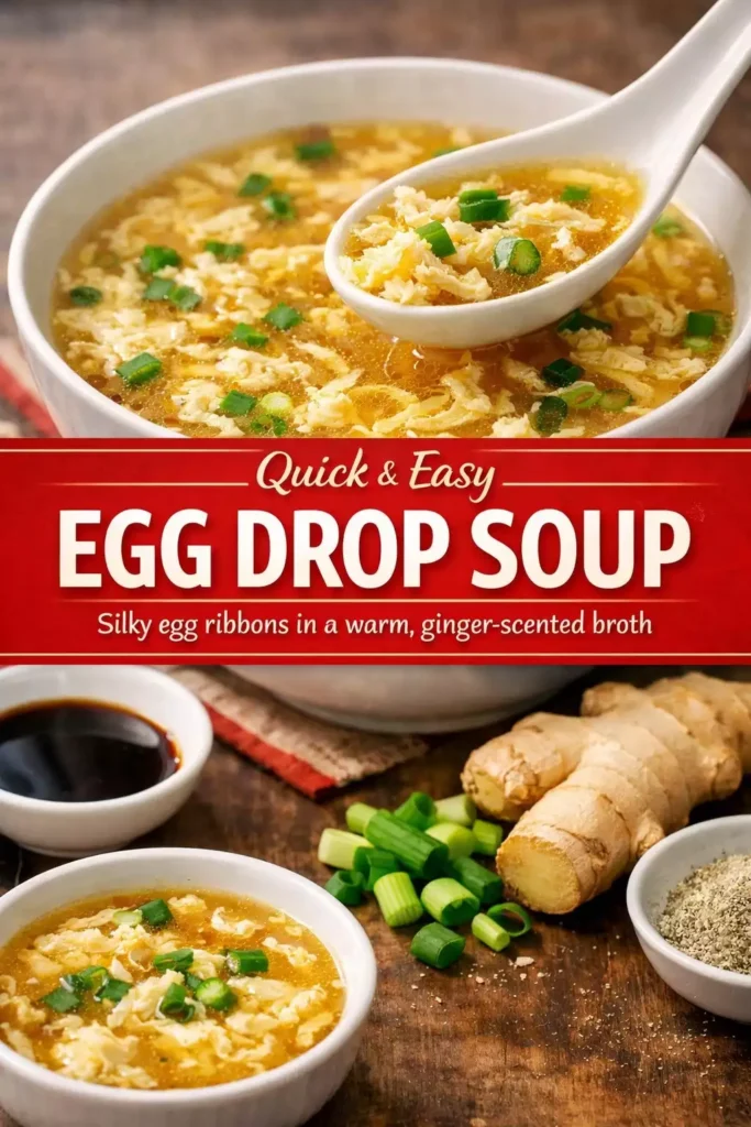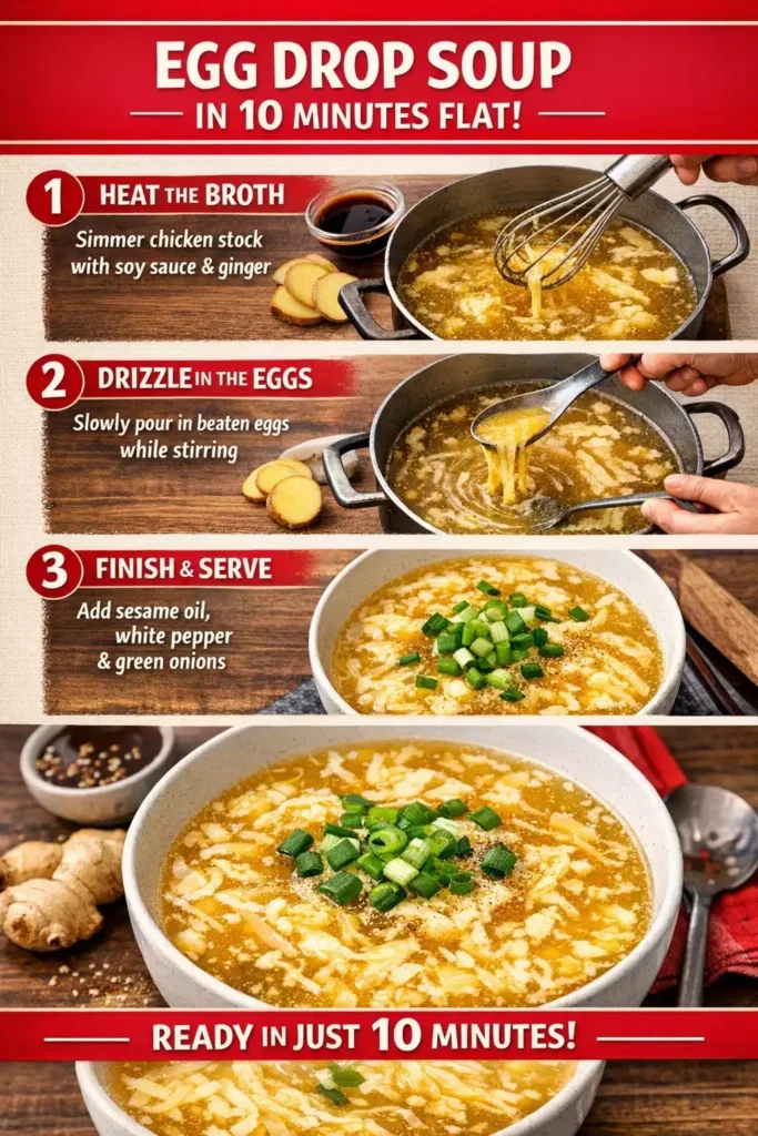 This is one of the fastest real recipes that exists. You heat stock. You add ginger and soy. You drizzle in beaten egg while stirring. You eat. That is the whole recipe. The technique of drizzling egg into hot liquid while stirring is the one skill involved and it takes approximately 30 seconds to master. The result is the silky egg-ribbon soup that every Chinese restaurant serves and that is genuinely simple to make at home.