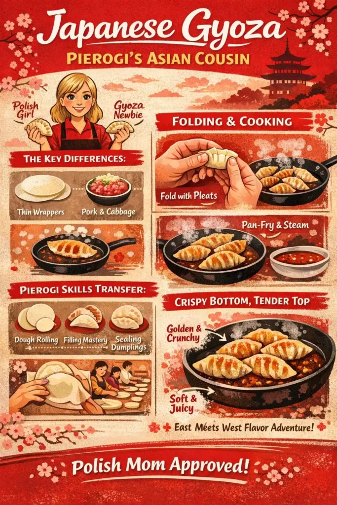 • Polish-Japanese fusion gyoza: Fill with potato-cheese pierogi filling. Pan-fry gyoza style. It sounds sacrilegious and tastes like two cultures high-fiving. I’ve served this at dinner parties and the conversation it starts is worth the effort alone.