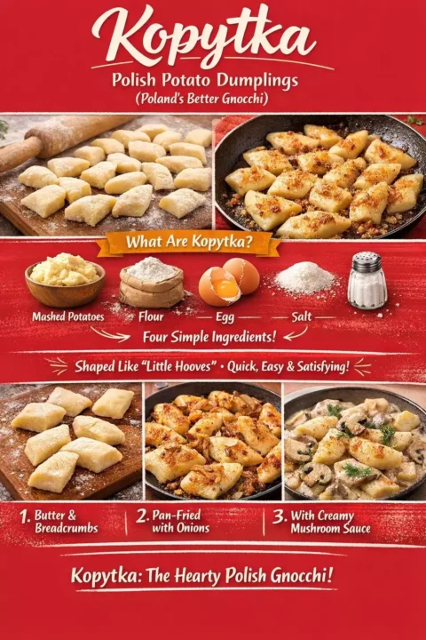 If you’ve had Italian gnocchi, you’ll recognise the concept — both are potato dumplings. But kopytka are denser, chewier, and more substantial. Gnocchi aims for light and pillowy. Kopytka aims for hearty and satisfying. Think of gnocchi as the elegant cousin who studied abroad, and kopytka as the one who stayed home and can carry three bags of groceries in each hand. Both great. Different energy.