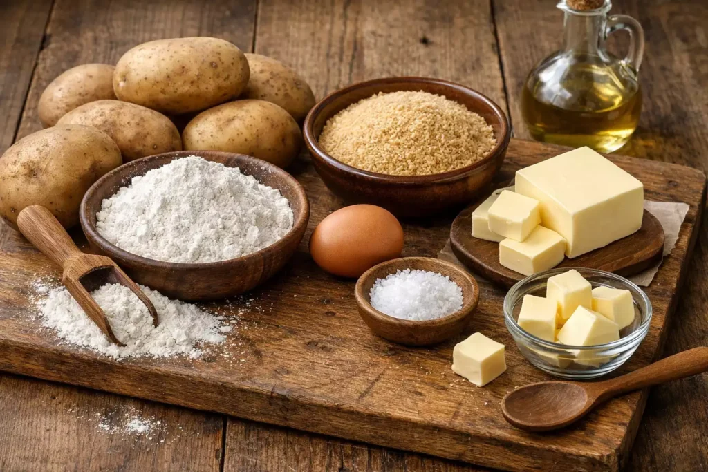 - • 1½ to 2 cups (190-250g) all-purpose flour — start with less, add more as needed. The exact amount depends on how wet your potatoes are.