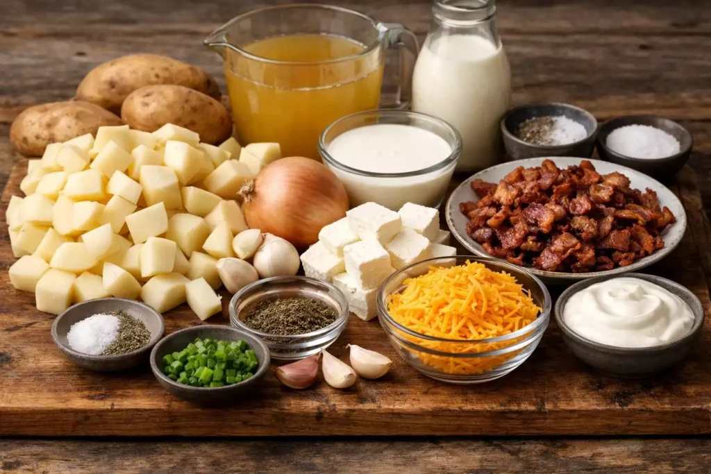 Russets work best because they’re starchy and break down, creating the thick, creamy base. Yukon Gold will work but won’t break down as much — you’ll get a chunkier soup. Red potatoes stay too firm. For loaded potato soup, Russets are the answer.