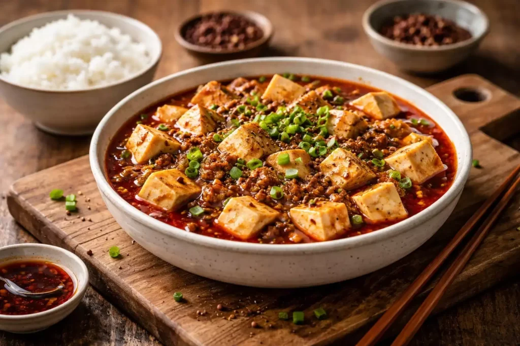 Over plain steamed white rice — the rice tempers the heat and absorbs the sauce. This is not optional. Mapo tofu without white rice is like making the sauce without the doubanjiang: technically possible but not the right experience. Pair with a simple cucumber salad or blanched greens to balance the richness. Dan dan noodles as a follow-up course makes this an extraordinary Szechuan dinner at home.