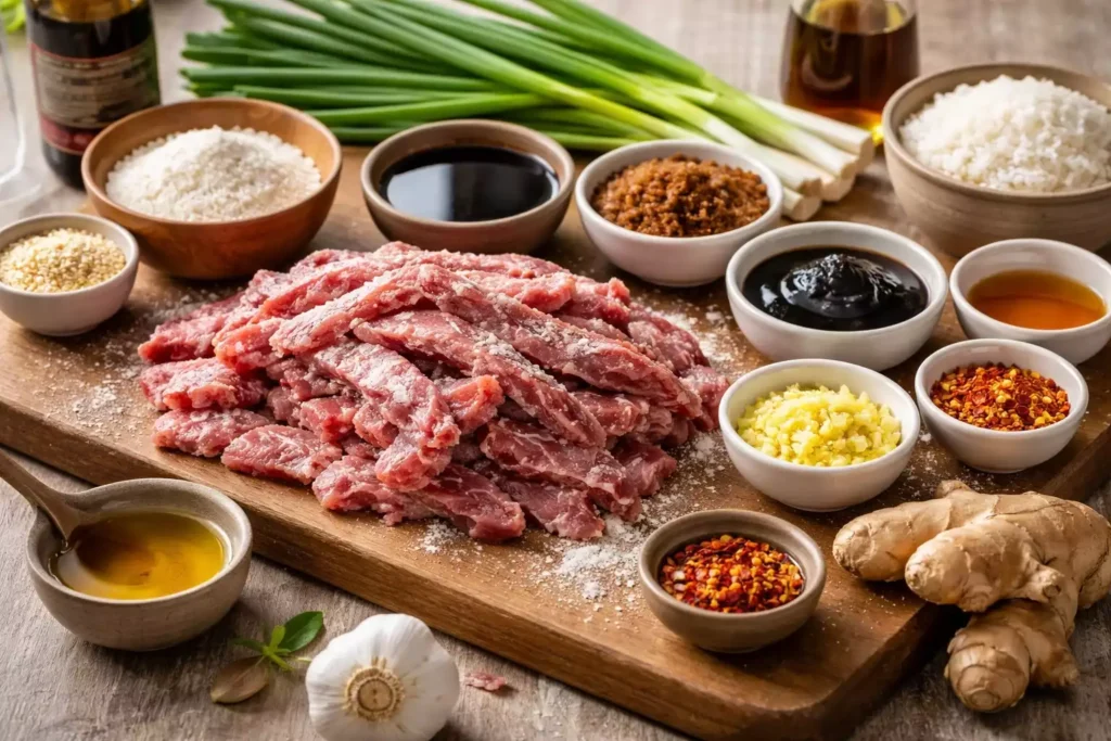 Mongolian beef uses a generous cornstarch coating on the beef before frying — much more than a light dusting. The thick cornstarch coating absorbs the sauce while maintaining some crispness at the edges, creating a texture that is simultaneously chewy, crispy, and saucy. This is different from the velveting technique used in beef and broccoli; here the cornstarch is a visible coating that creates texture rather than a protective marinade that keeps the beef tender inside.