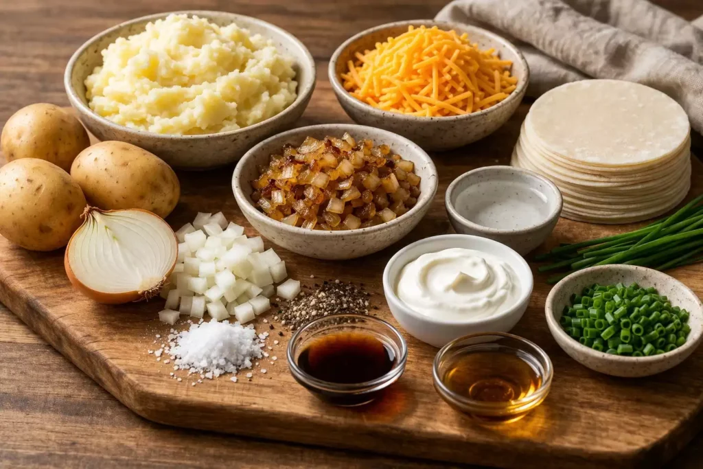 The result was a dumpling that’s thinner, crispier, and faster than traditional pierogi but still filled with the exact same potato-cheese filling that babcia perfected. Gyoza wrappers are paper-thin compared to pierogi dough — they crisp up beautifully when pan-fried, cook in 3 minutes instead of 5, and come pre-cut in perfect circles so you skip 30 minutes of rolling and cutting. The filling doesn’t know it’s in a Japanese wrapper. It tastes exactly the same. But the texture is different: lighter, crispier, almost like a pierogi that went to finishing school.