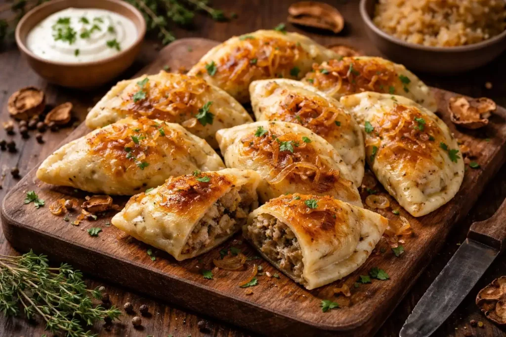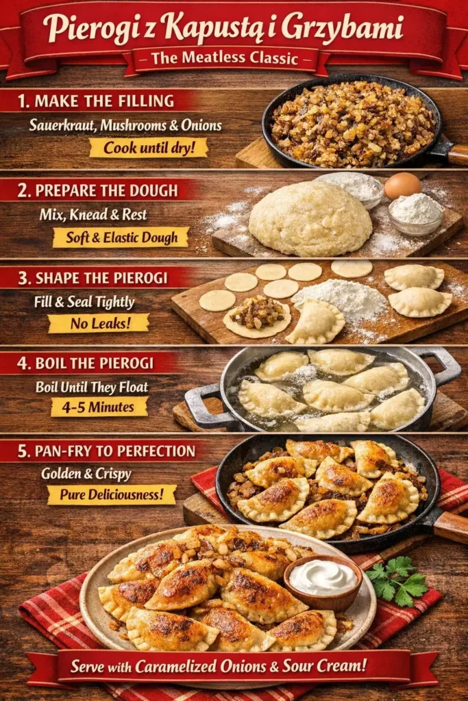 The filling — finely chopped sauerkraut and reconstituted dried mushrooms, sautéed with onion until dark and deeply fragrant — is one of the most complex-tasting things in Polish cooking despite having no meat in it whatsoever. The mushrooms provide umami that rivals any meat stock. The sauerkraut provides acidity. The onion provides sweetness. Together they fill a pillow of soft dough that when pan-fried in butter produces one of the most satisfying bites in the Polish culinary canon.