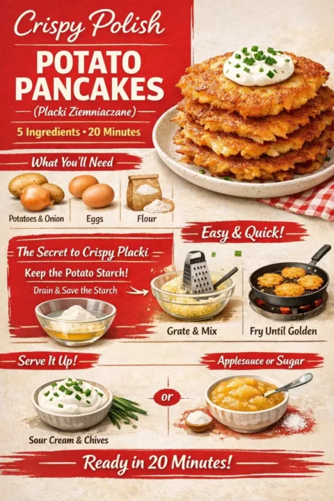 Placki ziemniaczane (pronounced “PLAHTS-kee zhyem-nyah-CHA-neh”) are Polish potato pancakes — grated raw potato mixed with egg and a little flour, fried in oil until impossibly crispy on the outside and soft in the middle. Five ingredients. Twenty minutes. A dish that’s been feeding Polish families since the 17th century when monasteries first started making them.