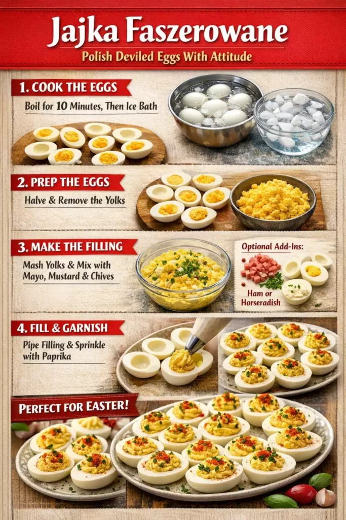 Deviled eggs but with a Polish accent and significantly more mustard. That is the shortest description I can give of jajka faszerowane, and it will have to do until you make them and taste the difference. The American deviled egg is gentle, creamy, mild. The Polish jajka faszerowane has opinions. It puts mustard in places that make people stop and wonder what they are eating and then eat four more before asking.