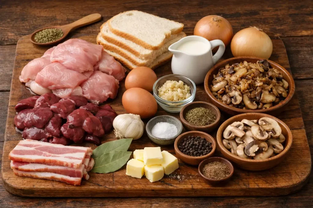 Roughly cut the chicken thigh, livers, and bacon into large chunks. Working in batches, pulse everything in a food processor until you have a coarse mince — not a smooth paste. You want texture, not baby food. Transfer to a large bowl. Add the cooled onion and mushroom mixture, the soaked bread (squeeze out excess cream first), and the eggs.