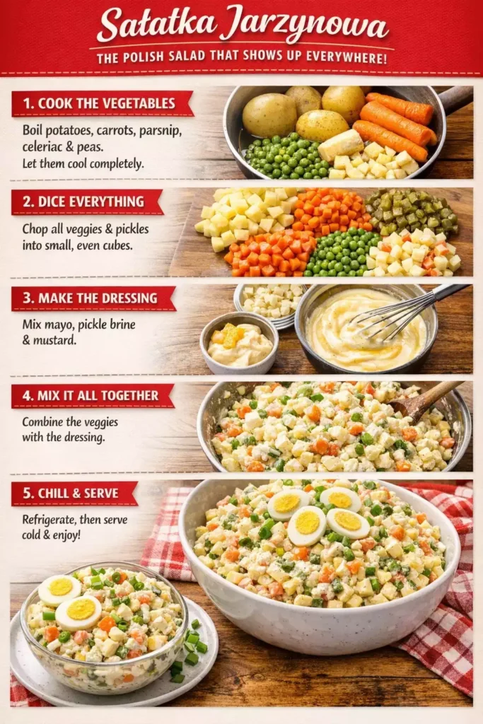 Make it the day before. Sałatka jarzynowa is always better after a night in the fridge. The flavors meld, the vegetables absorb the dressing, and the whole thing becomes more cohesive. Day-of sałatka is fine. Next-day sałatka is superior.