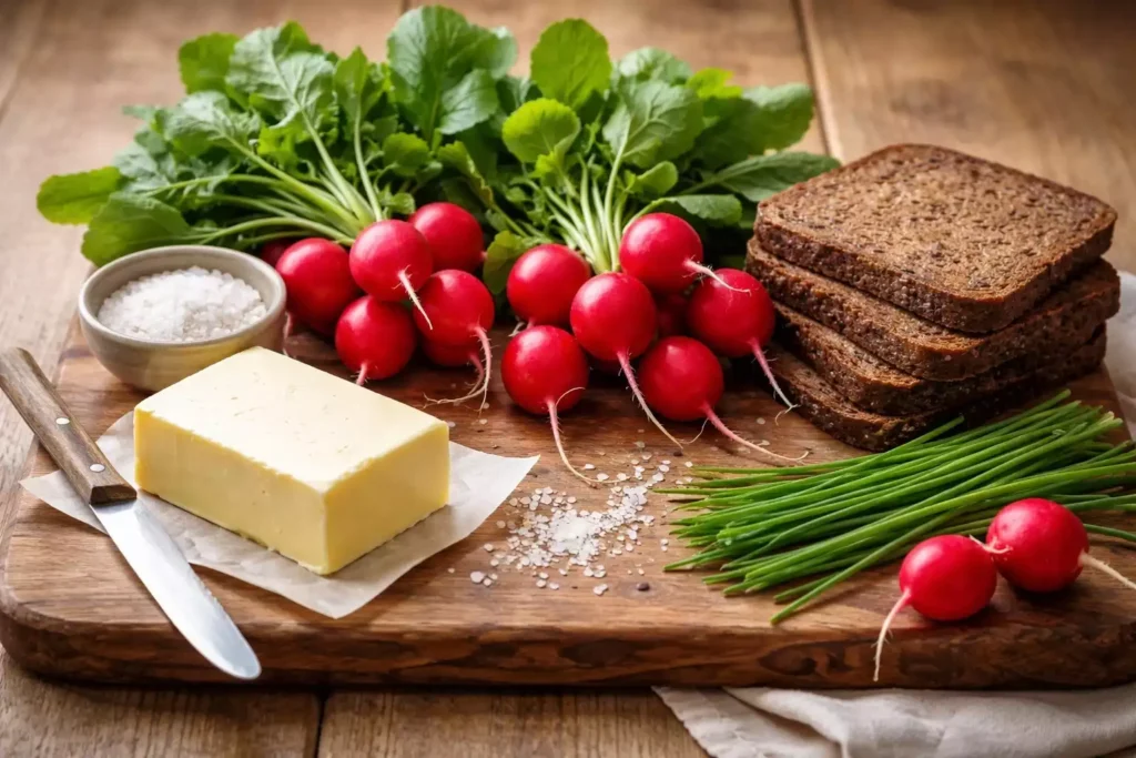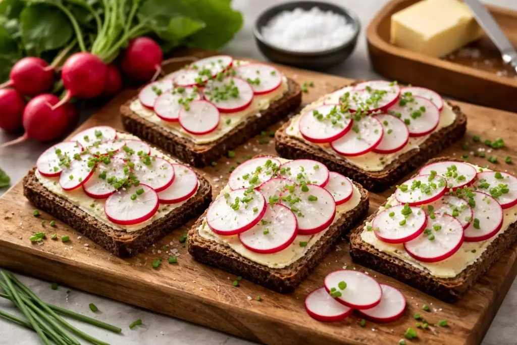 Dark bread is not optional. This works on dark rye bread. It works on pumpernickel. It does not work on white bread in the same way because the flavor profile is wrong. The slightly sour, earthy character of dark rye is what the radish and butter need as a foundation.