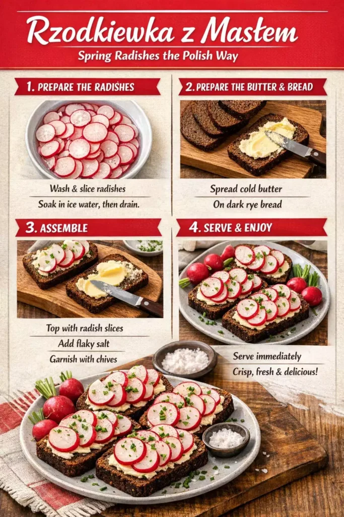 The radish in rzodkiewka z masłem is doing the work of a condiment as much as a vegetable. Its sharpness and pepper notes act like a palate cleanser between bites of rich Easter food. After a bite of ham or pasztet, a radish on buttered dark bread resets your palate completely and makes you want more of everything.