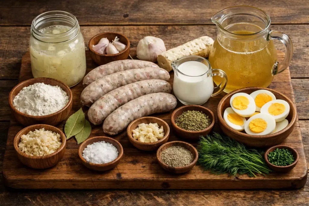 Polish biała kiełbasa is genuinely worth sourcing from a Polish deli if possible — its fresh, unsmoked character and marjoram seasoning are specific to this soup. In a pinch, any fresh pork sausage will work. Avoid smoked or cured sausages for a first attempt; they will change the flavor profile significantly.