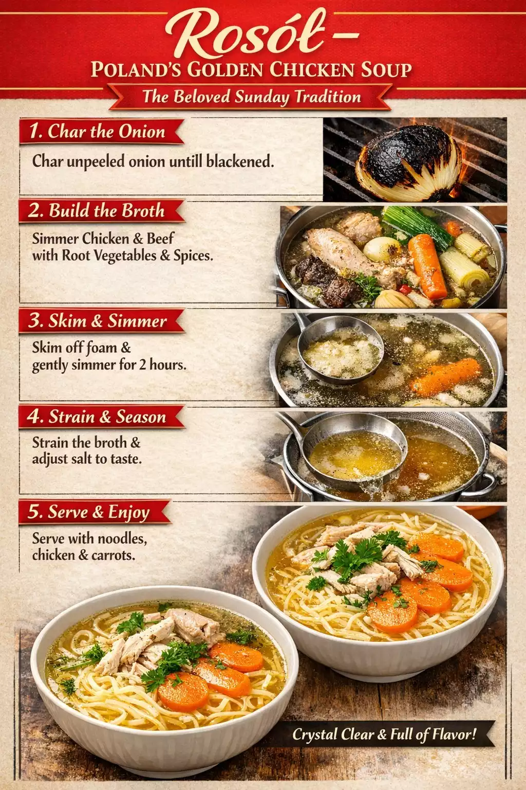 American chicken noodle soup is a one-pot comfort meal. Polish rosół is a clear, elegant consommé served as a separate course before the main dish. The differences are significant: