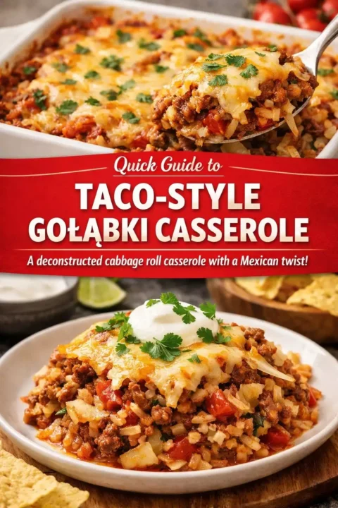 I love gołąbki but some days I don’t love ROLLING gołąbki. Blanching cabbage, shaving ribs, carefully tucking filling, hoping they don’t fall apart during cooking — it’s a labour of love that requires actual labour. On tired Tuesdays, I want the gołąbki flavour without the gołąbki effort. Enter: taco cabbage casserole. All the elements of cabbage rolls — ground beef, rice, cabbage, tomato sauce — layered in a baking dish instead of rolled into individual packets. Same ingredients, zero rolling, one dish, thirty minutes of oven time while I sit on the couch and pretend I’m resting.
