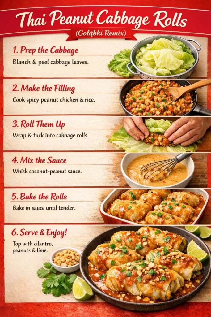 The idea came during a week when I had leftover cabbage from gołąbki (always too much cabbage, never enough filling — the universal gołąbki experience) and a fridge full of Thai condiments from pad thai night. My brain connected the two: cabbage rolls are just a delivery system. The filling can be anything. Why not Thai peanut chicken? The rolling technique is identical. The blanching-the-cabbage step is identical. Only the inside changes. And when the inside changed, something magical happened — the mild, sweet cabbage wrapped around spicy, nutty, lime-bright filling created a flavour contrast that was genuinely exciting.